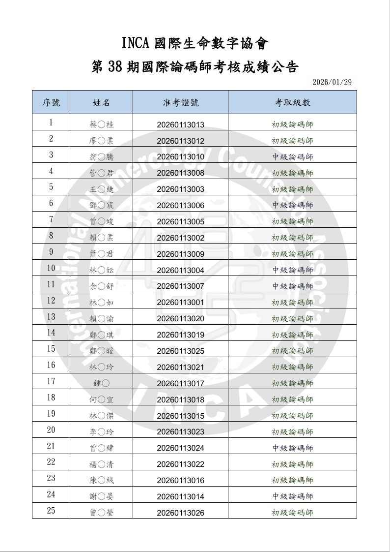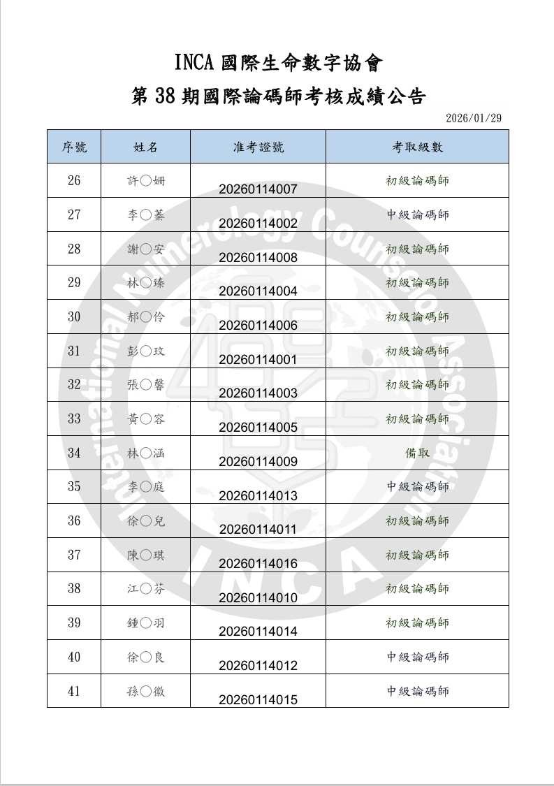 最新消息 |第38期 INCA 國際論碼師考核成績公告