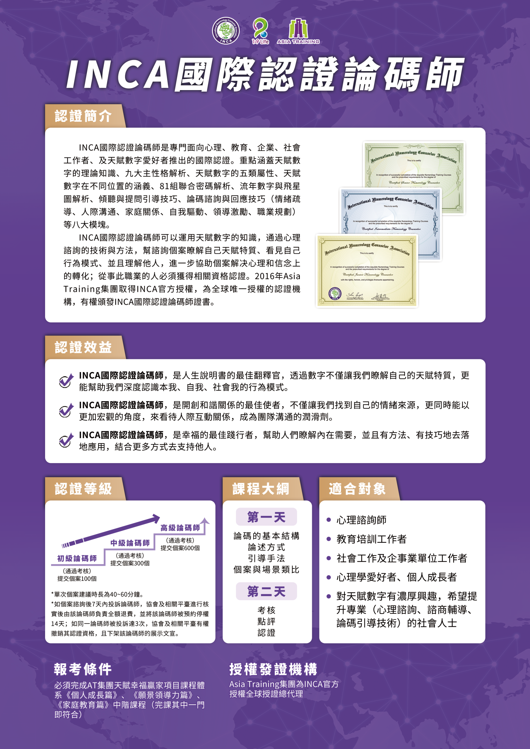 4.美國INCA協會已授權Asia Training集團為本協會在兩岸地區唯一有效認證機構,授權Asia Training集團頒發INCA的認證論碼師從業資格證書。